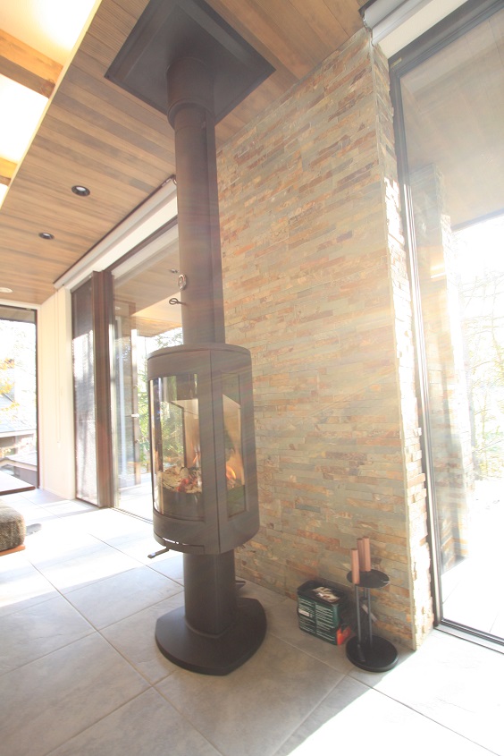木漏れ日が差し込む気持ちのいい日に試験焚きを行いました。窓と窓の間の壁に置かれたF373ADV、とても絵になります。大きな窓からの景色も素敵なS様邸。ストーブがあれば暖かく、ロールスクリーンを全開にして思う存分お庭を眺めることができますね。心地の良い空間でした。