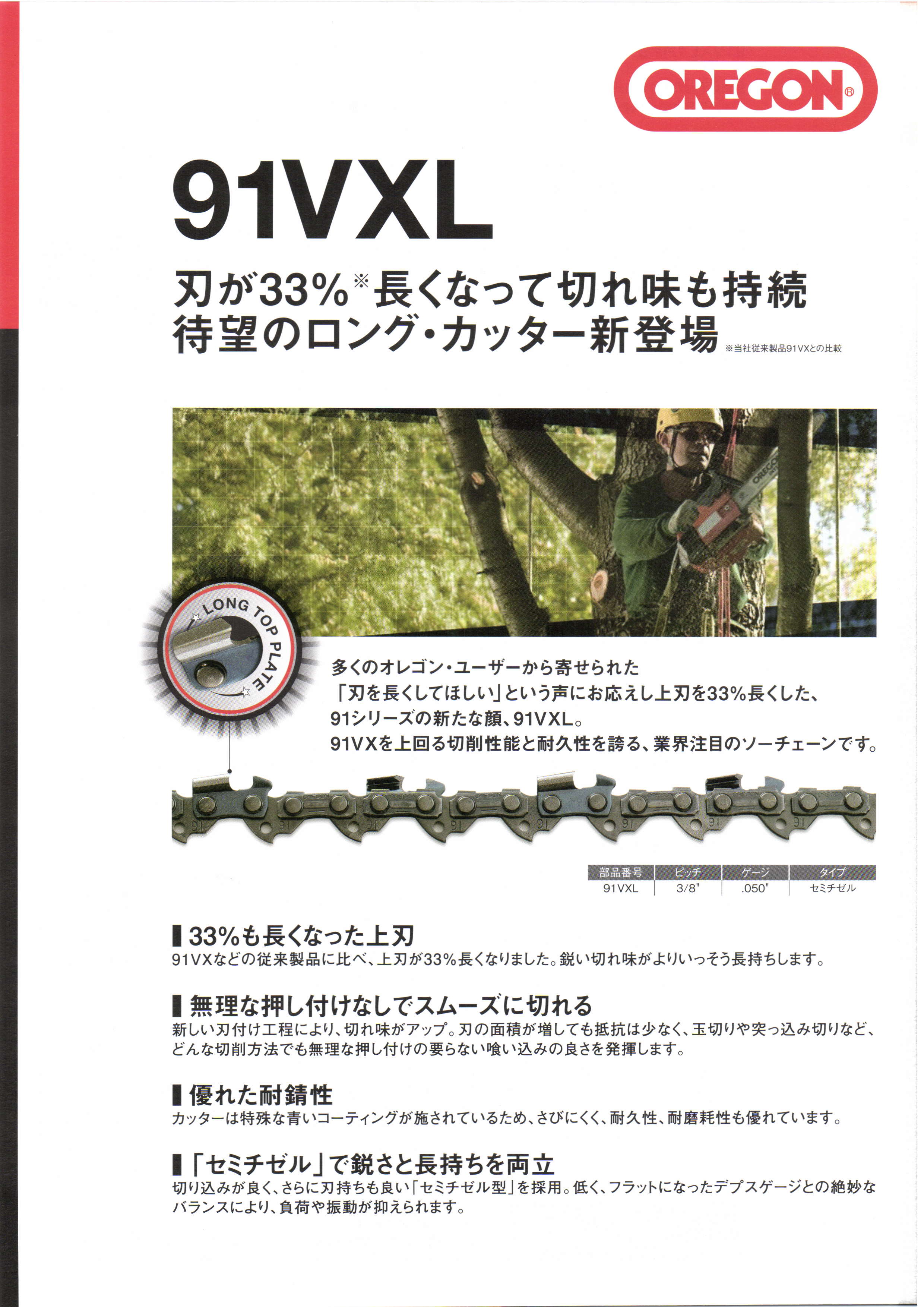 40cc以下の中型から小型チェンソーに装着される事の多い91シリーズのチェンから新しいタイプが発売されます。従来品との違いはカッター部に長い刃が装着される点です。軽快な切れ味の『セミチゼルカッター』はそのままに全体的に低く長い上刃がスムースな切削と耐久性を可能にしています。また低く直線的なデプスゲージは先端突っ込み切りでのブレを抑え安定した切り込みが出来ます。切れ味と耐久性が向上したNEW91シリーズをお楽しみに・・・。(尚、リールチェンの 発売は12月からの予定です。)
