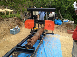 まずは杉の丸太を載せてエンジンをかけてレールの上を滑らせると・・・