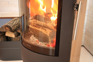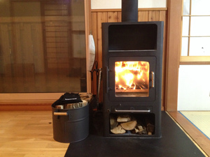 薪ストーブの炎と窓の外の和風庭園の景色とがマッチして